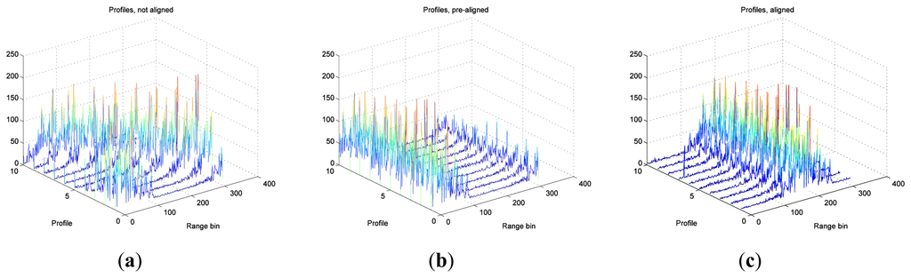 The next step after windowing and application of inverse Fourier transformations (using the IFFT algorithm) is the translational motion compensation of the obtained HRRPs. To align the profiles an algorithm based on the envelope correlation method [14,31] is applied first. In the case covered in this article, a reference profile is first established defined as a sum of six aligned profiles after applying correlation between them. The remaining profiles will then be aligned by correlating them to the reference one. Note that the reference profile must be updated after a new profile is aligned by including the new one to the reference profile and discarding the oldest one. After pre-alignment using envelope correlation (coarse alignment), a fine alignment is applied. This fine-alignment comprises three steps: first, a prominent scatterer must be selected; second, profiles are re-aligned by tracking the prominent scatterer along the profiles matrix; to do so, profiles maxima are found within a small band from the prominent scatterer and, when necessary, profiles are realigned. Finally, phase adjustment is carried out by using the dominant scatterer algorithm (DSA) [26,32] where the phase of the dominant scatterer previously selected is subtracted from the phase of the rest of the profiles already aligned. Figure 8 shows the whole translational motion compensation process; Figure 8(a) presents the initial 10 HRRPs of a measured Boeing-767, and as can be seen, these profiles are completely misaligned. By employing envelope correlation profiles are pre-aligned as shown in Figure 8(b). Lastly, after phase adjustment profiles are finally aligned as in Figure 8(c).