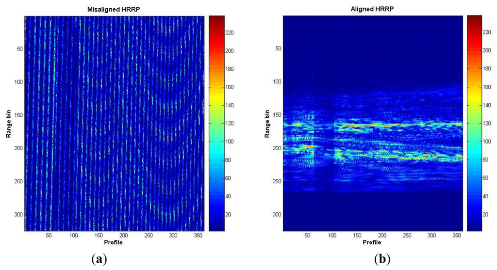 Generally speaking, target motion can be decomposed into translational and rotational [14,21,22]. In order to get focused images both the translational and rotational motion must be compensated. Translational motion causes consecutive HRRPs to be misaligned, so in order to compensate it an alignment of profiles must be completed, this procedure is also called range bin alignment. In addition to profile alignment, a phase adjustment procedure must be applied in order to refer every measurement to the same origin [9]. In the past decades, translational motion compensation has been of great interest and now it has become a well-established technology. Range bin alignment methods are rather standard, including centroid tracking [23,24], envelope correlation [14], contrast/entropy based methods [25], prominent point processing or dominant scatterer algorithm [26], etc.