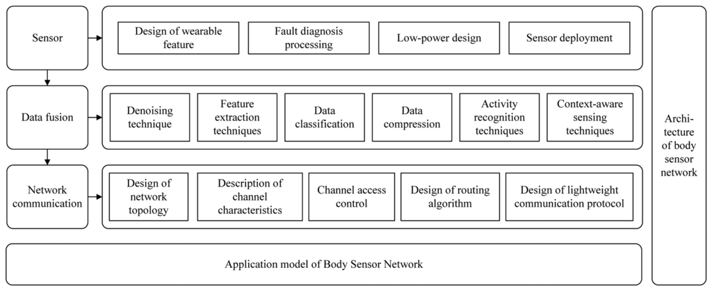 Nowadays BSN research still faces many key technical challenges. Figure 2 summarizes the main research areas of BSNs. The research work on sensor design and use mainly focuses on the wearability of sensor nodes [19], the capacity of fault diagnosis and fault treatment [20], energy consumption [21] and sensor deployment [22], etc. In the aspect of data fusion, research mainly includes the design and implementation of denoising [23], feature extraction [24], data classification [25], data compression [26], and other key technologies. A growing number of scholars combine situational awareness and data fusion technologies in the activity recognition area [27,28]. In the aspects of network communication, research mainly focuses on the problems of network topology design [29], channel characterization [30], channel access control [31,32], routing algorithm design [33], and lightweight communication protocols design, etc. These key technologies must be considered when building a complete BSN system. They are not only of great research value, but also of important practical value.