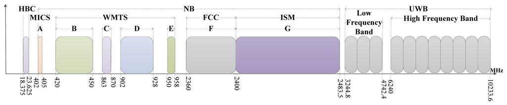 The physical channel, as the data transmission medium, plays a key role in the BSN. Its characteristics directly affect the performance of the whole network. Therefore, in order to achieve the best transmission performance, the most suitable channel must be chosen according to different data transmission scenes. Figure 3 presents all the bands in a BSN. The Human Body Communication (HBC) band which takes the human body as the data transmission medium is only used by BSNs. Its primary technology is electric field coupling which includes capacitive coupling and galvanic coupling [105,106]. An HBC channel of the capacitive coupling type is developed based on the near electric field around body which is induced by a transmitter terminal, and a receiver terminal is used to detect the weak coupling changes of the near electric field along the human body channel. Research has shown that the data rate of capacitive coupling is up to 2 Mb/s [107]. In addition, Reference [108] has put forward a kind of electromagnetic coupling technology which takes human body as the electromagnetic waveguide to finish communications. Medical Implant Communications Service (MICS), which has a transmission power of 25 μW, is also one of communication bands suitable for low data rate networks [109]. The Wireless Medical Telemetry Service (WMTS) is mainly used in wireless telemetry in hospitals. Its band is similar to some parts of the local TV spectrum in the United States, but no research on interference between the two bands has ever been done so far. Band F is the 2.36 GHz medical band newly approved by the Federal Communication Commission (FCC) in the United States. The Industrial Scientific Medical (ISM) band commonly used in BSNs operates at 2.4 GHz. Hence, for the sake of avoiding interference, corresponding solutions which could deal with interference must be designed [110]. UWB communication is believed to have great advantages and is promising in WBAN applications. It is a technique with low-power and high data rate features. Its large bandwidth signals provide robustness to jamming with low probability of interception. Moreover, UWB can be used to monitor vital respiration and heart-rate parameters [111–113]. In addition, UWB has good penetrating properties that could be applied to imaging in medical applications [114].