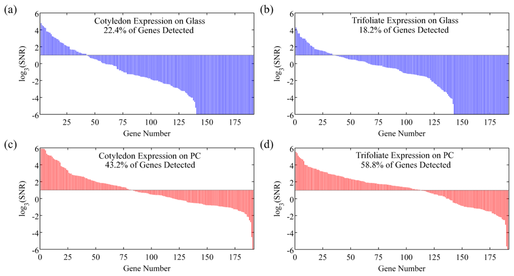 However, SNR enhancement is a more relevant measure over signal enhancement because microarray data analysis programs use SNR values to classify spots as detected or not detected. It is possible to achieve good signal enhancement without achieving similar SNR enhancement if a substrate enhances fluorescence but also has a large noise value, thus avoiding any advantages of fluorescence enhancement. We observe that the PC not only attains a large signal enhancement but it also achieves an SNR enhancement of approximately 10 × (measured over all spots in the experiment), suggesting that the array can detect hybridization at concentrations 10 × lower than can be detected on glass substrates. Since the SNR is enhanced by more than one order of magnitude on PC substrates, genes with expression levels that were lower than the noise floor on glass substrates can now be measured on PCs. This allows researchers to preserve the advantageous throughput of microarrays while increasing the sensitivity of their measurements. The practical effect of the PC is to improve the dynamic range of the expression measurements and allow for quantification of low expression genes. The direction of differential expression in these low expression genes is confirmed by sequencing data, which agreed with the microarray analysis for 39 of the 41 genes identified as differentially expressed only on PC microarrays. By expanding the dynamic range of the microarray experiment, the number of genes for which statistically significant changes in expression could be observed improved from 26 to 66 genes, or from 13% to 34% of the genes probed in the experiment. This suggests that the detection capabilities of current microarray protocols can be greatly expanded by just the substitution of conventional substrates with an enhanced fluorescence substrate like the PC. By enhancing fluorescence, more than double the number of genes were identified on the PC as differentially expressed between the trifoliate and cotyledon tissues, demonstrating that enhanced fluorescence offers practical benefits to a DNA microarray experiment (Figure 10).