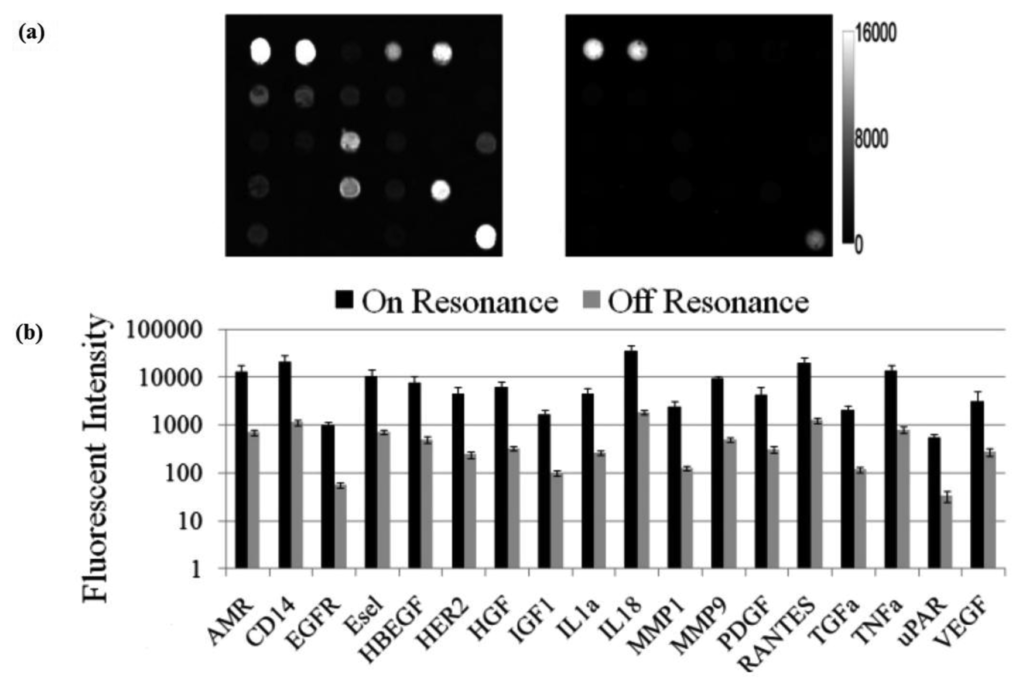 Antibody-based protein microarrays are a valuable tool for studying cellular protein production with potential applications as a clinical tool in disease diagnosis and drug discovery [44–47]. Protein microarrays are a favorable platform for the detection of circulating biomarkers because they combine multiplexed detection, minimal reagent usage, and high sensitivity. By running calibration standards alongside patient samples, protein microarrays provide quantitative measurements of analyte concentration. Furthermore, protocols have been developed that demonstrate multiplexed detection of biomarkers in serum through fluorophore-tagged secondary antibodies. In many clinically relevant applications, such as for detection of biomarker proteins that are expressed by cancer cells at a tumor site and subsequently diluted by the total blood volume of a person, a target protein may only be present at concentrations in the 1–100 pg/mL range [48–51]. There is substantial interest in extending the limits of detection (LOD) and generally increasing the SNR in order to diagnose disease at the earliest possible stage and to quantify biomarker levels at concentrations that were below previous limits of detection. Fluorescent-based detection of chemically tagged analytes has been demonstrated as a robust, highly specific, and easily multiplexed method for achieving high sensitivity [52–57].