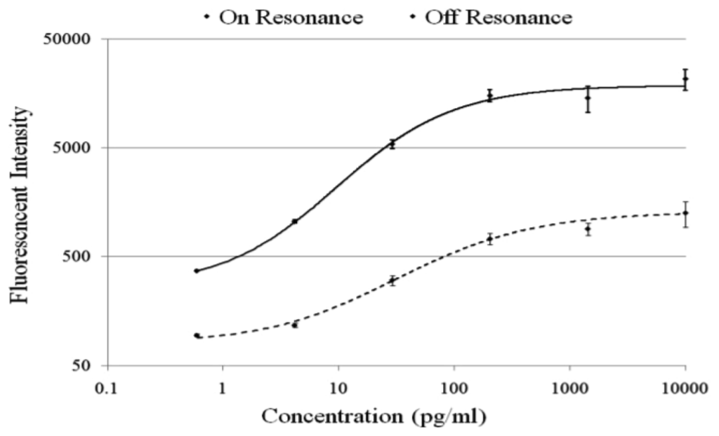 The PC enhances the output of any fluorophore within the evanescent field region, regardless of whether the source of the fluorescence is a Cy5 molecule within the capture spot area, a Cy5 molecule nonspecifically bound outside the capture spot area, autofluorescent material within the device structure, or autofluorescence from the chemical functionalization layer. It is observed that when the PC is on-resonance, the background intensity is 4 to 5-fold higher compared to the off-resonance condition. Even so, an overall SNR enhancement of 3.8- to 6.6-fold was observed for the assays because the magnitude of the PC enhancement is greater within the capture spots than in the regions between the spots. Observed enhancements in SNR is particularly important for detecting antigens at low concentrations—For example, two antigens EGFR and uPAR were detected at concentrations as low as 3.6 and 7.1 ng/mL, respectively. At the PC off resonance, the spot signals for EGFR and uPAR at these same concentrations were noise-limited (SNR < 3) and could not be differentiated from the local background fluorescence. However, at the PC resonance, these same spots were detectable (SNR > 8) over the background. The ability to detect reduced concentrations of such antigens is extremely important to the early detection of disease biomarkers, which in general are present at very low concentrations in serum. The signal intensities from each dilution in the concentration series were used to generate standard curves using the Protein Microarray Analysis Tool (ProMAT) software, developed by Pacific Northwest National Laboratory. A representative standard curves for TNFα when the PC is on-resonance and off-resonance is presented in Figure 13. We found that when on-resonance, the PC demonstrated better precision as indicated by the steeper slope in the linear region of the standard curves, and ∼10-fold reduced limit of detection. Dose-response curves for detection of one biomarker (TNFα) is shown in Figure 14, with measurements taken on-resonance and off-resonance, in which the enhanced excitation effect provides a clearly amplified signal for all concentrations.