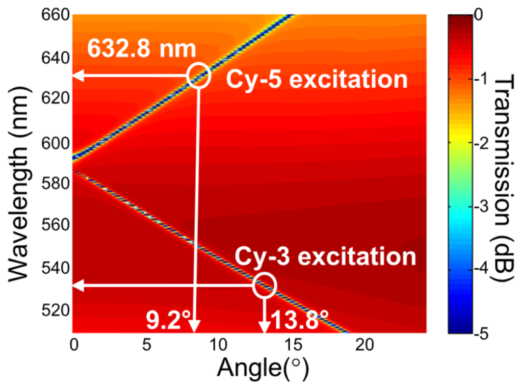 A PC structure usually supports two orthogonal modes: transverse electric (TE) polarized and transverse magnetic (TM) polarized. The electric field vector of TM modes are oriented perpendicular to the grating lines of a one dimensional PC structure, while the electric field vector of TE modes is oriented parallel to the grating lines. Compared to TE modes, the resonant modes associated with TM polarization have higher Q-factor, resulting in stronger field intensity near the device surface. Therefore, the PCEF surfaces are generally designed to have one TM mode at the excitation wavelength of the fluorophores for near field enhancement, resulting in “enhanced excitation”. The PC can also be designed to have a second resonant mode (TE or TM) that overlaps with the emission spectra of the fluorophores, to direct the emitted photons towards the detection optics to obtain an enhanced extraction effect [18]. Fluorescent output efficiently coupled into the second resonant mode exhibits an angle dependent emission.