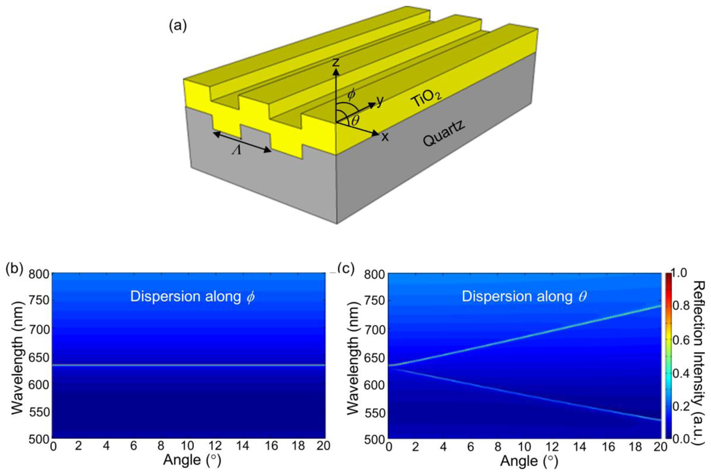 When a 1D PC is illuminated by a broadband light source, highly efficient reflections from its surface represent the resonance modes at a specific wavelength and a specific angle combination. Figure 6(b and c) show such measured resonant modes for a PC shown in Figure 6(a) when the angle of incidence is scanned from 0° to 20°, both in n and θ directions respectively (labeled in Figure 6(a)). Here, θ is the angle between the incident beam and the grating's normal vector in the plane perpendicular to grating direction and ϕ is the angle in the plane along the grating direction. These photonic band diagrams were obtained by illuminating the device with collimated broadband light from a tungsten lamp, and analyzing the reflected light with a spectrometer (USB 2000, Ocean Optics, Denedin, FL, USA) as a function of incident angle. It is evident that the resonant wavelength is not sensitive to the angles along ϕ while it changes dramatically when the angle of incidence is varied along the θ direction. Using a narrow bandwidth light source, such as a solid-state laser, a misalignment of incidence angle by 0.1° with respect to the resonant angle θR will reduce the coupling efficiency of the laser to the PC by a factor of 10. On the other hand, the resonant modes exhibit a very small angular dependence (∼0.3 nm/°) along the ϕ direction. Therefore, to efficiently couple light into the 1-D PC surface, the excitation laser beam only needs to be collimated and tuned along the θ direction.