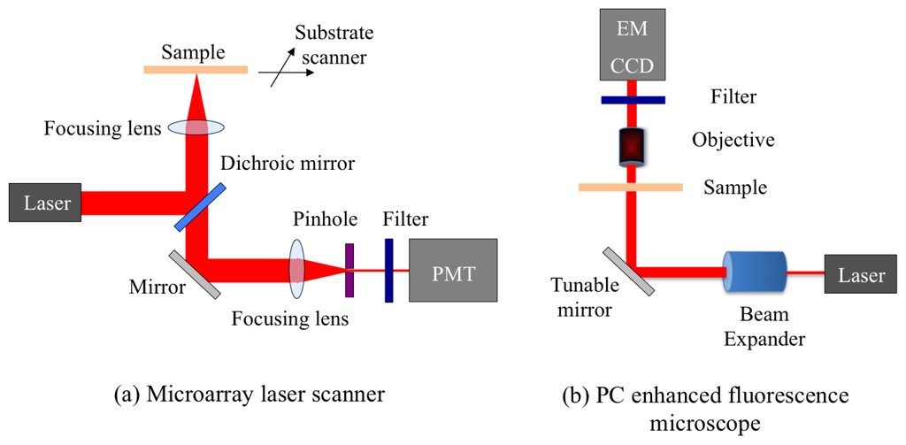 The schematic of a custom-built fluorescent detection system, which is referred to as the PC enhanced fluorescence microscope (PCEFM), is shown in Figure 7(b). In the PCEFM system, the PC fluorescence is imaged by an electron-multiplying charge-coupled device (EMCCD, Hamamatsu Inc., Shizouka Pref., Japan) via a 4 × microscope objective (numerical aperture N.A = 0.1). Unlike the confocal laser scanner, the PCEFM works in an imaging mode, which significantly improves the throughput for generating an image of a large microarray, as an entire field of view (determined by the magnification of the objective lens) is captured in a single measurement. A He-Ne laser is used as the excitation light source, and a bandpass filter is placed in front of the detector to prevent excitation laser wavelength from reaching the camera.