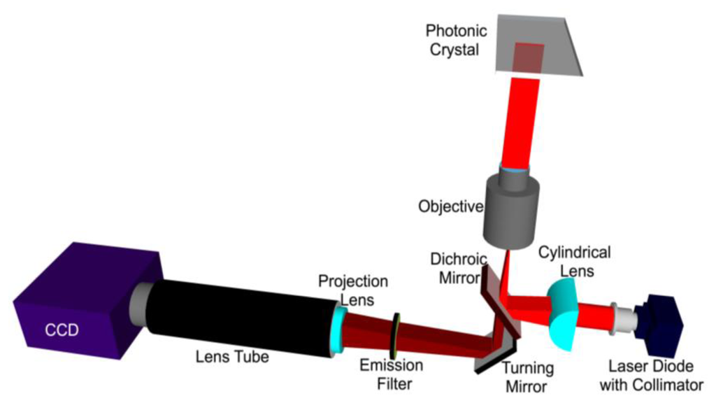 A schematic diagram of the line scanning configuration is shown in Figure 8. The system is comprised of a 70 mW solid-state laser (AlGaAs) at λ = 637 nm coupled to a polarization maintaining fiber, a half wave plate, a cylindrical lens, a long pass dichroic mirror, and a 10 × objective (Olympus Plan N, Center Valley, PA, USA) of focal length 18 mm. The fiber tip is coupled to a fiber collimator giving a highly collimated output beam of 3.4 mm in diameter. The output beam then passes through a half-wave plate, which is used to rotate its polarization to match with the PC-resonant mode to be excited. The laser beam is then focused in the ϕ direction to a line by a cylindrical lens (f = 100 mm). The focused laser line is then directed onto the back focal plane of the microscope objective via a dichroic mirror. The output of the objective is thus a laser beam focused to a line.