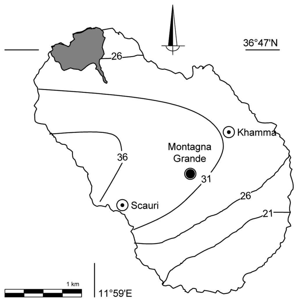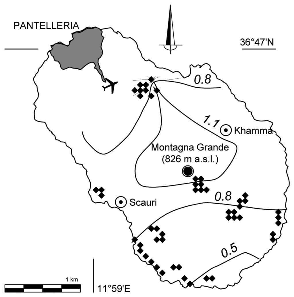 Pantelleria (36°N 12°E), the major satellite island of Sicily (83 km2), is the summit of a partially revealed volcano located 100 km S of Sicily and 70 km N of Tunisia on the axis of the Sicily Channel Rift Zone. The volcanic edifice is a stratovolcano emerging above sea level at 836 m, which is covered by tephra layers including basalts, felsic lavas, and trachytes and pantellerites tuffs erupted mainly 300 ka and 50 Ka producing ignimbritic deposits up to 20 m thick [19]. The island is semi-arid with a typical Mediterranean climate (MAT 18 °C, MAP 409 mm) with monthly average temperatures fluctuating between 12 and 26 °C [20]. First archaeological facts date 35 Ka ago although the island remained almost uninhabited until the Carthaginians occupied it, followed by the Romans and later by the Arabs. Pantelleria, in fact, provided obvious stop-over sites on the traditional North-South axis of the wheat and non-food good trade [20–22]. Pantelleria is characterized by a uniqueness of its landscape, in which natural elements do not prevail over the artifacts created by man, mainly its drywalls and cylindrical gardens. Pantelleria has been nearly totally terraced during centuries and cultivated with grapevine, caper, and olive trees. Adaptive field fragmentation allow numerous small property owners to adapt to changing climate and cost of labor [23]. About 80% of these terraces are nowadays abandoned [18] and small areas of pristine forests and Maquis are rather widespread. Following the abandonment of agricultural activity, which took place from the middle of the last century, areas of considerable extent have been affected by succession processes [24].