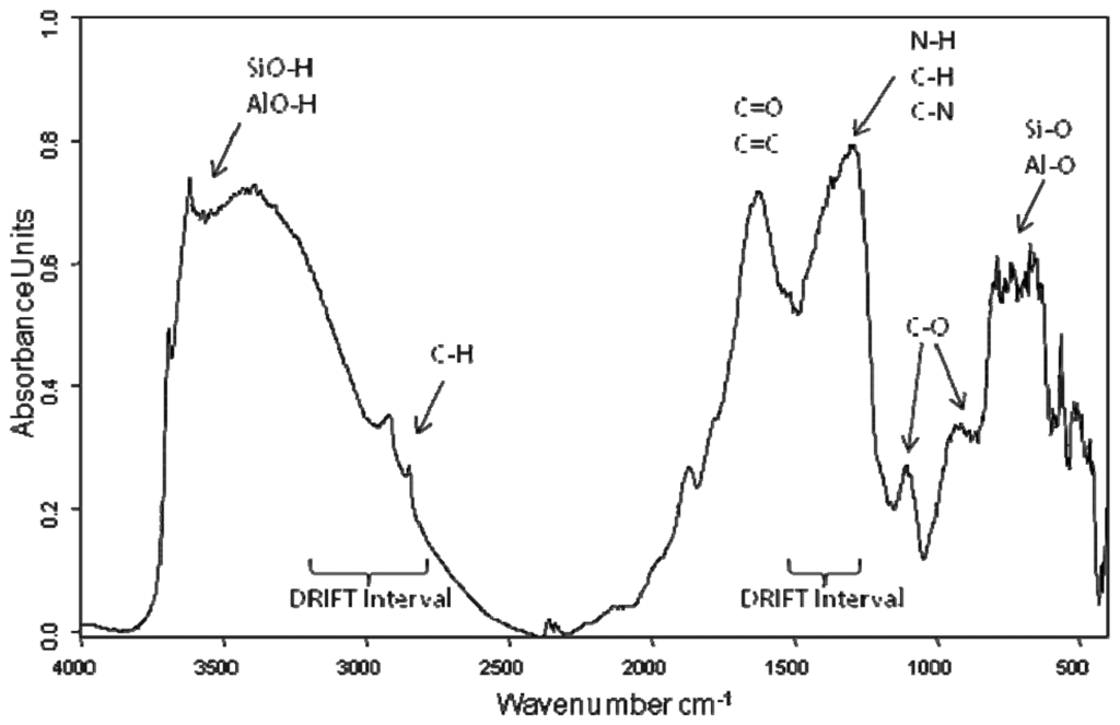 Mid-infrared spectra contain information on major functional moieties of organic matter, such as alkyl C, C-O-C from polysaccharides, aromatic carbonyl bands, aromatic C=C stretching vibrations, and C=O from carboxylic acids, aldehydes and ketones and so on. In the range 3,700–3,500 cm−1 were assigned the sharp peaks of SiO-H and AlO-H stretching. The broad adsorption band in the range 3,500–2,500 cm−1 was indicative of the presence of the O–H and N–H groups, widely involved in hydrogen bonds. It was possible to see overlapped also the weak peaks around 2,900 cm−1 assigned to C–H stretching of CH3 and CH2 groups. The band at 1,730 cm−1 was generally due to C=O stretching of COOH and other carbonyl groups [10–13]. The bands at around 1,650–1,600 cm−1 were attributed to several group vibrations including aromatic C=C and C=O stretching of amide I groups (in protein like compounds) and the absorption at about 1,540 cm−1 was ascribed to N-H deformation and C-N stretching of amides (amide II group) [10–13]. The shoulder appearing at 1,460–1,450 cm−1 was by aliphatic C-H deformations and/or aromatic ring vibrations. The broad band in the range at 1,450–1,220 cm−1 was attributed to O-H deformation, C-O stretching of phenolic OH and C-H deformation of -CH2 and -CH3 groups together C-O stretching and O-H deformation of carboxyls and C-O stretching of aryl ethers, and finally a band between 1,150 and 1,000 cm−1 was due to C-O stretching of polysaccharide or polysaccharide-like substances [12,13]. No band in the range 2,650–2,500 cm−1, attributable to carbonate group was detected in our spectra in agree with chemical determination. Figure 2 reports a typical spectrum obtained in DRIFTS measurements while in Table 2 were summarized the principal structural assignments.