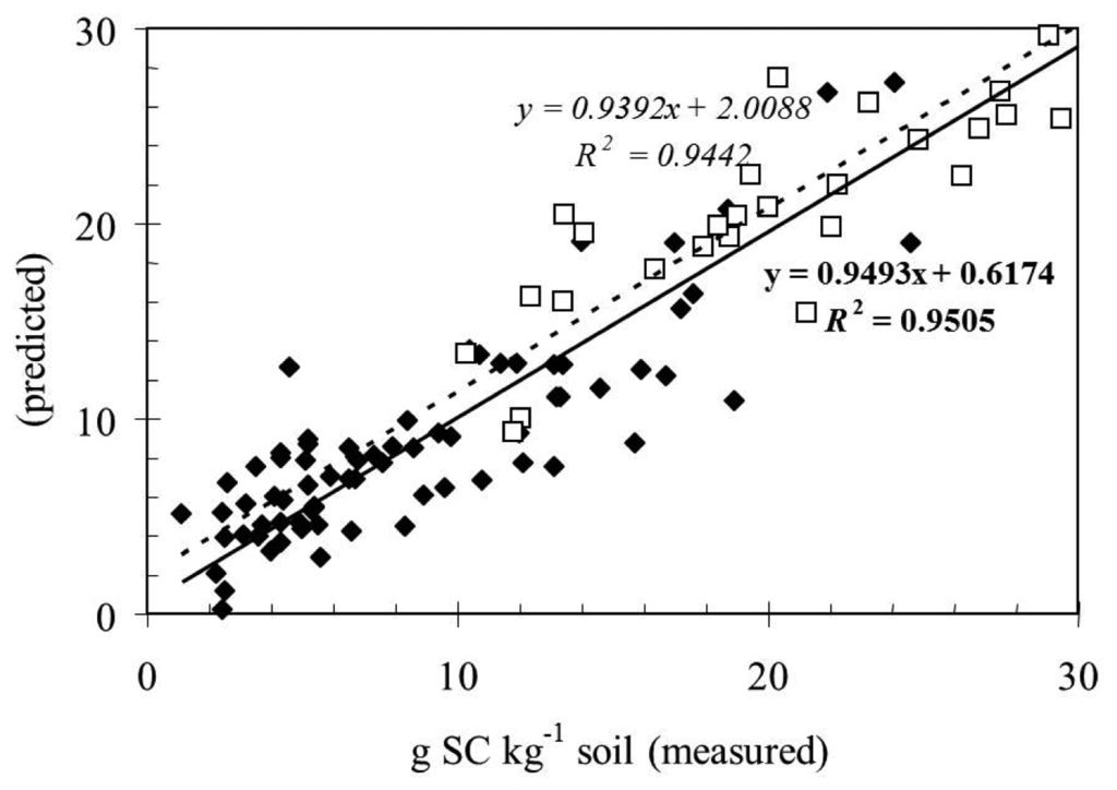 For the optimized PLS calibrations, some spectral data points, not contributing to the relationship between spectra and the specific soil property, were removed from the final calibration models. Such data filtering resulted in some slight improvement of the prediction accuracies. The R2 values were 0.951 for C and 0.945 for N. These values agree reasonably well with those reported by other researchers in the USA, Australia [28,29] and particularly with other three Italian islands [17]. The RPD values (SD/RMSECV, where SD is standard deviation and RMSESCV is root mean square error of cross-validation) for C and N (4.49 and 4.28, respectively) were consistent with a good analytical accuracy. A significant degradation of infrared PLS accuracy and precision for C by carbonate interference was reported by Reeves [30], but this effect was obviously not observed with our data.