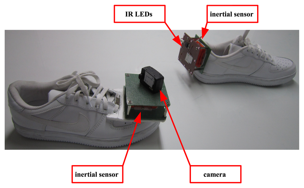 The picture of the proposed system is given in Figure 1. Two IMUs (XSens MTi) are attached on both feet. An USB camera (Pointgrey FireFly MV; is attached on the right foot and eight infrared LEDs are attached on the left foot. The movement of two feet is estimated using an inertial navigation algorithm. The relative position between two feet is estimated by capturing the LEDs on the left foot from the camera on the right foot.