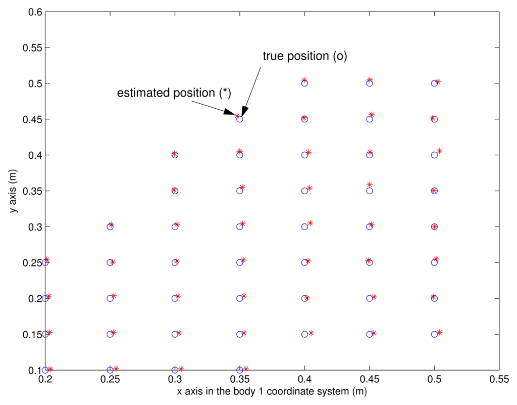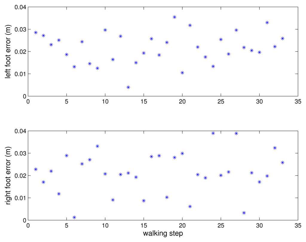 Now the accuracy of the proposed system is evaluated. First, we test the accuracy of the vision-based position estimation, which is used to estimate the vector between two feet. The left shoe is located on different positions of the grid while the right shoe is located on the fixed position. The estimated left shoe position with respect to the right shoe is compared with the true value, which can be obtained from the grid. The result is given in Figure 10, where the position represents the origin of the body 2 coordinate system in the body 1 coordinate system. We can see the position can be accurately estimated using the proposed system (eight infrared LEDs). The mean error distance is 0.4 cm and the maximum error distance is 0.8 cm.