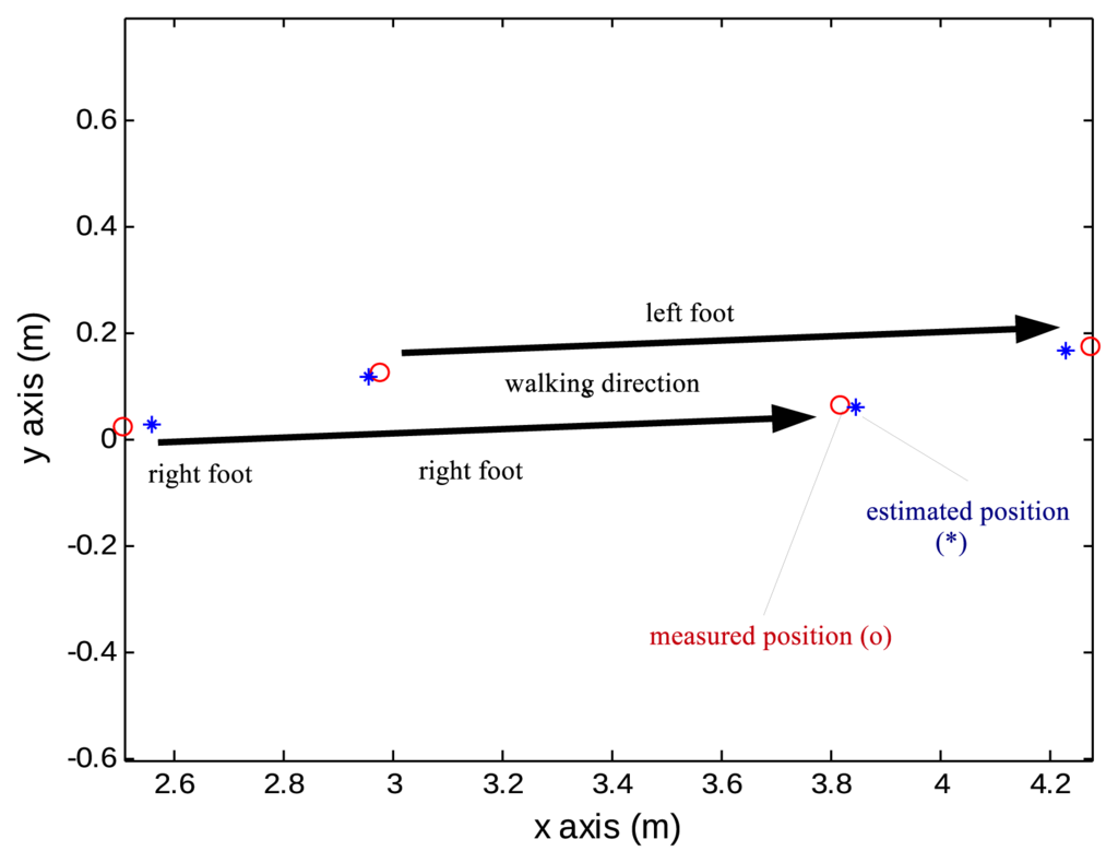 The next task is to evaluate the accuracy of the trajectories. A person walked on the long white paper with marker pens attached on both shoes. Marker pens are attached on shoes so that dots are marked on the white paper whenever a foot touches the floor. Marked dot positions are measured with a ruler and these values are considered as true values. The estimation positions during zero velocity intervals (when one foot is on the floor) are compared with marked dots. One step result is given in Figure 11.