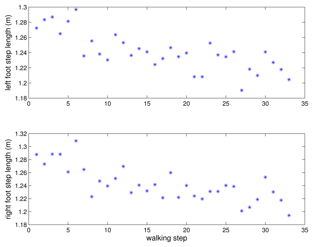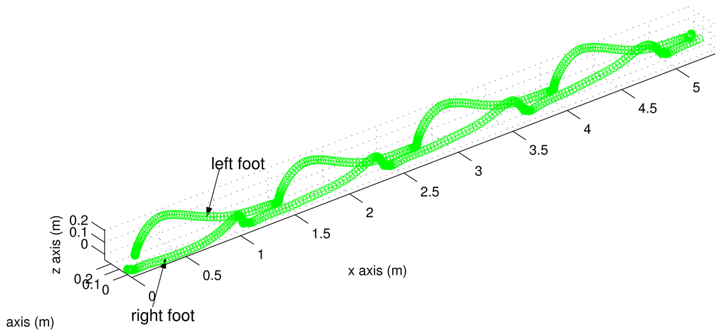 Three dimensional trajectories are given in Figure 8. There is a difference between the left and right foot motion patterns. This is due to the difference in the positions of inertial sensors: the inertial sensor unit is on the front in the case of the right foot and on the back in the case of the left foot (see Figure 1).