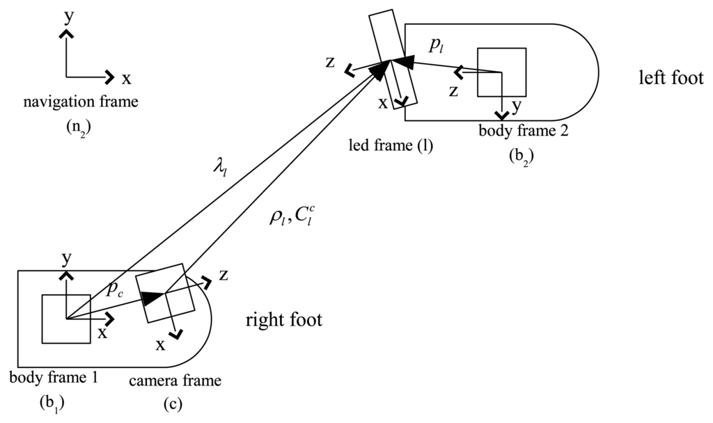 Five coordinate systems are used in the paper (see Figure 2). Three axes of the body 1 (2) coordinate system coincide with three axes of IMU on the right (left) foot. The origin of the camera coordinate system coincides with the pinhole of the camera. The LED coordinate system is defined as in Figure 2. The navigation coordinate system is used as the reference coordinate system. The z axis of the navigation coordinate system coincides with the local gravity vector and the x axis can be chosen arbitrarily.