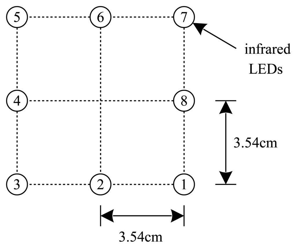 There are eight infrared LEDs on the left foot as in Figure 3. A number is assigned to each LED. These LEDs are captured using the camera on the right foot. To simplify the image processing algorithm, an infrared filter is placed in front of the camera.