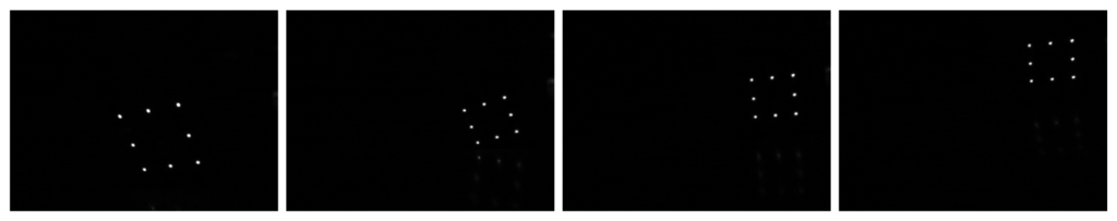 The typical infrared LED images during walking are given in Figure 4. A simple image processing algorithm can be used to obtain the center points of infrared LEDs.