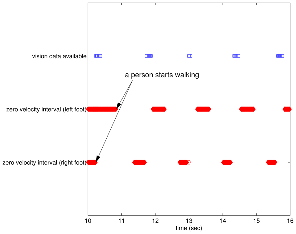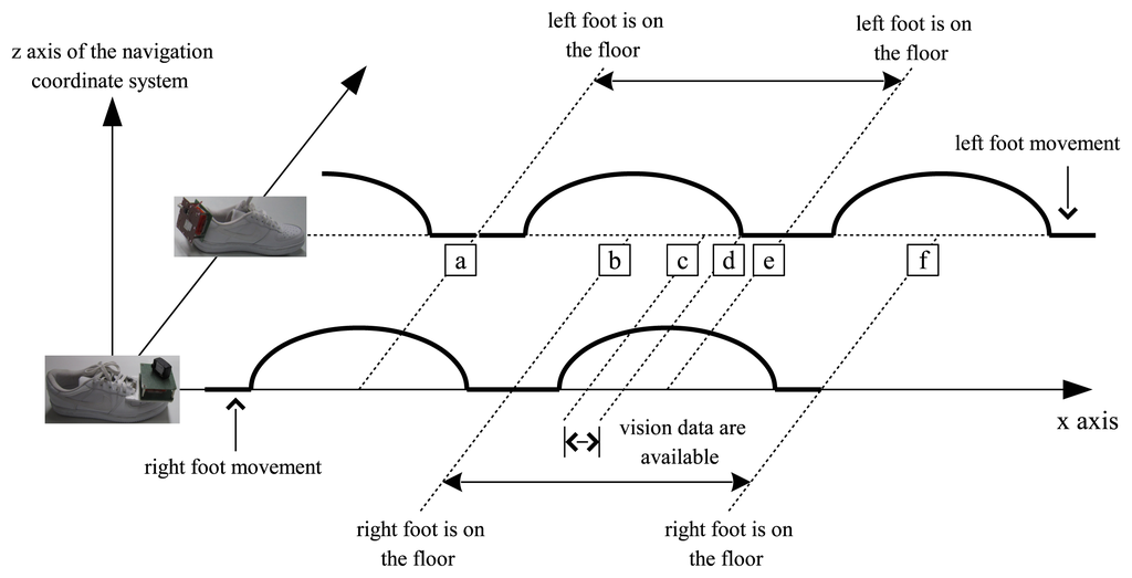 In the time domain, the relationship between zero velocity intervals and vision data available intervals is given in Figure 7. As illustrated in Figure 5, vision data are available between the right foot zero velocity intervals and the left foot zero velocity intervals during walking.