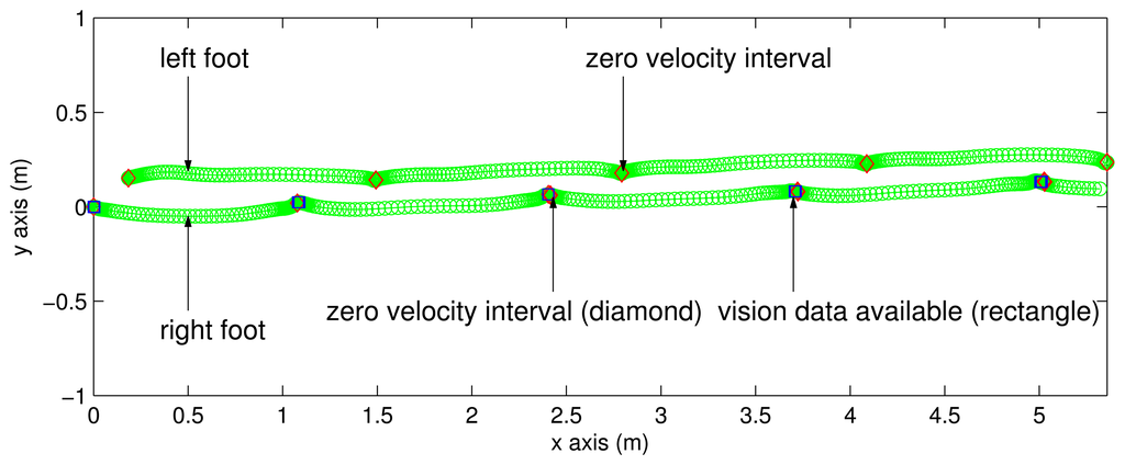 To verify the proposed system, a person walked on the floor and the two feet motion was estimated using the proposed algorithm. The estimated two feet trajectory on the xy plane in the navigation coordinate system is given in Figure 6. Since the x direction of the navigation coordinate system can be chosen arbitrarily, the trajectories are rotated so that the walking direction coincides with the x axis. The left foot trajectory is the upper one and the right foot trajectory is the lower one. The zero velocity intervals are indicated with the diamond symbols. The rectangle symbols indicate that vision data are available at those positions (that is, LEDs on the left foot can be seen from the camera on the right foot).