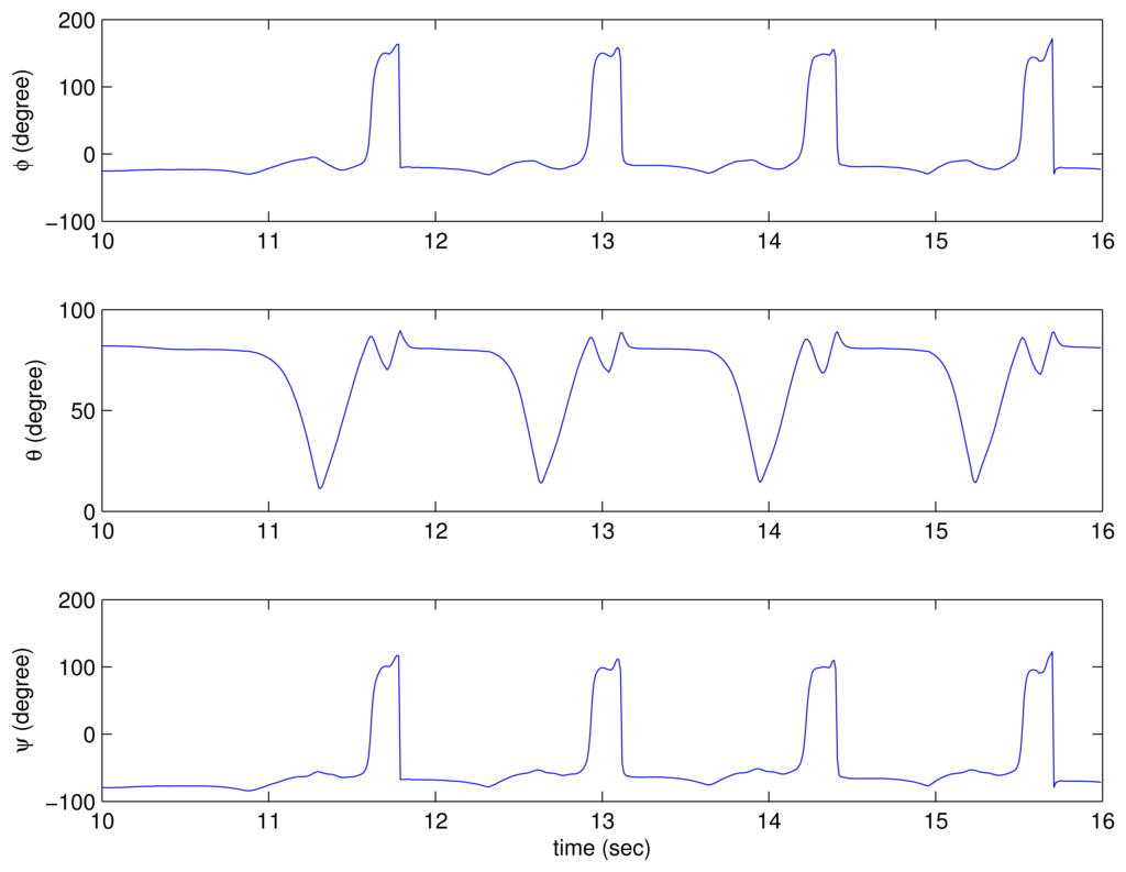 In addition to trajectories, attitude and velocity are also available from the inertial navigation algorithm. For example, estimated attitude (in Euler angles) of the left foot is given in Figure 9.