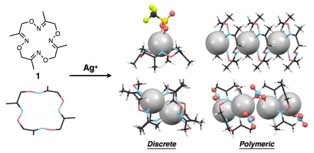 Macrocyclic compounds that can bind cationic species efficiently and selectively with their cyclic cavities have great potential as excellent chemosensors for metal ions. Recently, we have developed a tetraoxime-type tetraazamacrocyclic ligand 1 formed through a facile one-pot cyclization reaction. Aiming to explore and bring out the potential of the tetraoxime macrocycle 1 as a chelating sensor, we report herein the preparation of several kinds of silver complexes of 1 and their unique coordination structures determined by single-crystal X-ray diffraction analyses. As a result, the formation of two kinds of discrete structures, monomeric complexes [Ag(1)X] (X = counter anions) and a dimeric complex [Ag2(1)2]X2, and two kinds of polymeric structures from a mononuclear complex, [Ag(1)]nXn, and from a dinuclear complex, [Ag2(1)X2]n, was demonstrated. In the resulting complexes, the structurally flexible macrocyclic ligand 1 was found to provide several different coordination modes. Notably, in some silver complexes of 1, AgI–AgI interactions were observed with different AgI–AgI distances which depend on the kind of counter anions and the chemical composition.1. Introduction