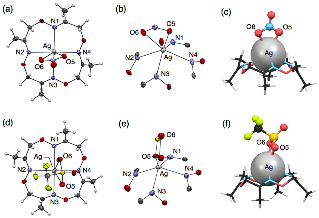 Crystallisation of a mixed solution of 1 with AgCF3SO3 in CH3CN-toluene produced a similar complex, [Ag(1)CF3SO3] (Figure 2(d)). This structure also has a shuttlecock-like structure with a six-coordinate AgI ion bound by four nitrogen atoms of 1 and two oxygen atoms of a CF3SO3− anion (Figure 2(e,f)). This chiral complex [Ag(1)CF3SO3] also exists as a racemate in the crystal. In comparing Ag–N bond distances in both complexes, [Ag(1)NO3] and [Ag(1)CF3SO3], an average Ag–N distance of 2.490 Å for [Ag(1)CF3SO3] is significantly shorter than that of 2.536 Å for [Ag(1)NO3] (Tables 2 and 3). In contrast, an average Ag–O distance of 2.641 Å for [Ag(1)CF3SO3] is significantly longer than that of 2.513 Å for [Ag(1)NO3]. This is probably due to the difference in the basicities of both anions, CF3SO3− and NO3−.