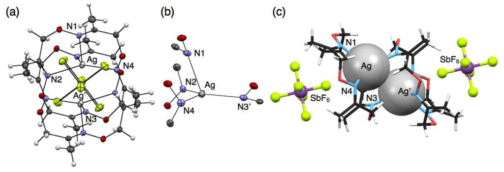Crystallisation of a solution of 1 and five equivalents of AgSbF6 in CHCl3 yielded colorless block crystals composed of a cationic, dimeric silver complex, [Ag2(1)2] (SbF6)2, as proven by single-crystal X-ray analysis (Figure 3(a)). In this structure, an AgI ion sits on the three upturned nitrogen atoms of 1 to form a shuttlecock-like structure which is similar to the structures of [Ag(1)NO3] and [Ag(1)CF3SO3]. However, another one nitrogen atom N(3) of 1 binds to another AgI ion to form a dimeric complex [Ag2(1)2]2+ with a four-coordinate AgI ion (Figure 3(b)). The average Ag–N distance of 2.421 Å for [Ag2(1)2]2+ (Table 4) is obviously shorter than those of six-coordinate [Ag(1)NO3] and [Ag(1)CF3SO3]. Notably, the resulting dimeric structure shows AgI–AgI interactions with a distance of 3.364 Å, which is shorter than the sum of van der Waals radii (Ag–Ag = 3.44 Å) [23,24]. The dimeric structure with a pair of AgI ions is composed of an enantiomeric pair arising from the chiral conformation of 1. In this crystal, the non-coordinating anions SbF6− do not bind to AgI, but are accommodated in the bowl-shaped pocket of 1 surrounded by four methyl groups (Figure 3(c)).
