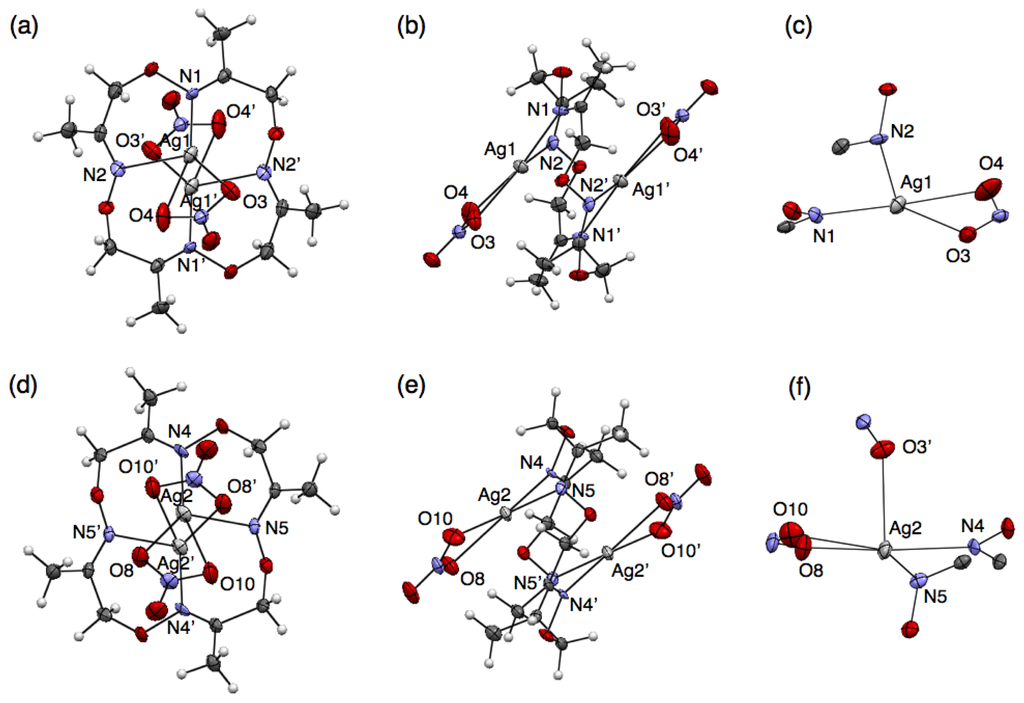 Another polymeric silver complex was found as plate crystals from a mixed solution of 1 and 10 equivalents of AgNO3 in CH3CN-toluene, which are different conditions from those used with the mononuclear complex, [Ag(1)NO3], formed from the CH3CN solution as block crystals. The single-crystal X-ray analysis of the plate crystal revealed a unit structure of a neutral, dinuclear silver complex, [Ag2(1)(NO3)2], for a one-dimensional coordination polymer, [Ag2(1)(NO3)2]n. The stair-like conformation of 1 is almost the same as [Ag(1)]n(BF4)n, thus 1 in [Ag2(1)(NO3)2]n can also bind two AgI ions to form a polymeric structure. Notably, the coordination polymer is composed of two kinds of [Ag2(1)(NO3)2] units. In one [Ag2(1)(NO3)2], the Ag(1) atom adopts a four-coordinate structure with two nitrogen atoms of the same 1 and two oxygen atoms of one NO3− anion (Figure 5(a–c)). Meanwhile, the other [Ag2(1)(NO3)2] contains a five-coordinate Ag(2) atom bound by two nitrogen atoms of 1, two oxygen atoms of one NO3− anion and one oxygen atom of another NO3− (Figure 5(d–f)). Importantly, both [Ag2(1)(NO3)2] structures show AgI–AgI interactions with different distances (Ag(1)–Ag(1′): 3.235 Å, Ag(2)–Ag(2′): 3.348 Å) (Table 6).