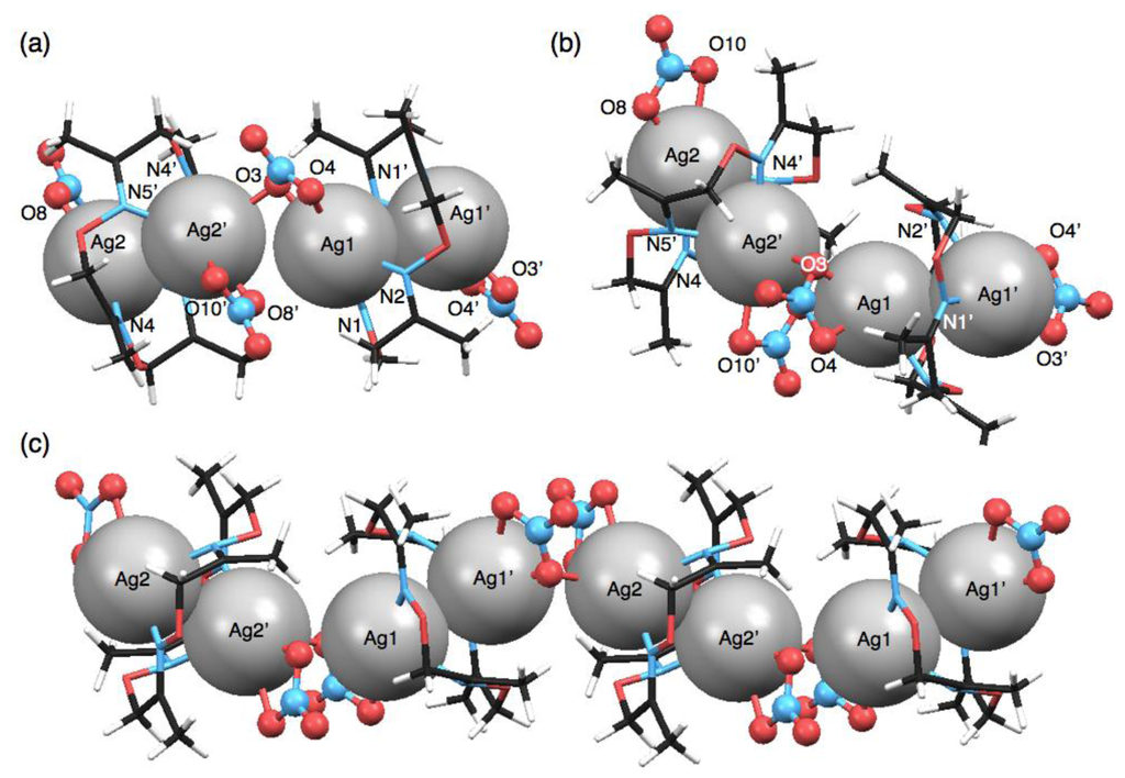 Both [Ag2(1)(NO3)2] units are crookedly connected with each other through an O(3) atom of one NO3− anion (Figure 6(a,b)). The inter-unit AgI–AgI distance of 3.709 Å is relatively short. As the result of alternate arrangement of two [Ag2(1)(NO3)2] units, AgI ions are aligned in a zigzag fashion (Figure 6(c)). In the crystal packing structure, the coordination polymers are arranged parallel and closely.
