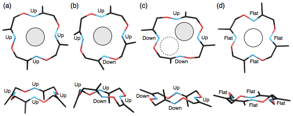 In contrast to the discrete complexes, the present polymeric complexes, [Ag(1)]n(BF4)n and [Ag2(1)(NO3)2]n, and previously reported [Ag2(1)(CF3CO2)2]n [16], possess a stair-like conformation of 1, in which two nitrogen atoms and the other two atoms of 1 are oriented to upper and lower faces, respectively (Figure 7(c)). As the result, one macrocycle 1 can bind two AgI ions on both faces simultaneously to form polymeric structures. It should be also noted that the stair-like conformation is quite similar to the conformation of metal-free ligand 1 [16], suggesting that the polymer formation of silver complexes of 1 seems to be less strained, predictable structures.
