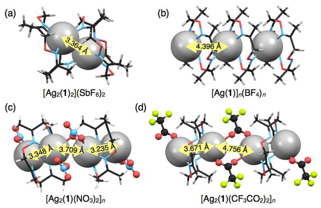 Construction of AgI–AgI bonded AgI chain arrays in crystals has attracted much attention in the fields of crystal engineering, supramolecular chemistry and metal–organic frameworks, because the AgI ion possesses flexible coordination geometries and labile and diverse bonding manners such as AgI–N, AgI–π, AgI–AgI [29,30]. Therefore, a novel molecular platform for AgI-based coordination polymers would make a significant contribution to this research area. In this study, several types of crystalline AgI complexes were constructed, in which the AgI–AgI distances varied due to the structural flexibility of 1. For example, in three mononuclear discrete complexes, [Ag(1)NO3], [Ag(1)CF3SO3] and [Ag(1)CF3CO2], AgI ions are chemically isolated. On the other hand, the dimeric complex, [Ag2(1)2] (SbF6)2, possesses an isolated AgI-pair with AgI–AgI interaction (AgI–AgI distance: 3.364 Å) (Figure 8(a)). The polymeric complex based on mononuclear units, [Ag(1)]n(BF4)n, does not include any AgI–AgI interactions, but forms a one-dimensional AgI array in the crystal [Figure 8(b)]. In contrast, the polymeric complex based on dinuclear units, [Ag2(1)(NO3)2]n, allows the formation of an AgI array involving two different AgI–AgI distances of 3.235 and 3.348 Å (Figure 8(c)). Interestingly, a polymeric complex, [Ag2(1)(CF3CO2)2]n, with different counter anions forms a similar AgI array but with longer AgI–AgI distances of 3.671 and 4.756 Å (Figure 8(d)) [16]. These results suggest that the alignment properties of AgI complexes in the crystal states would vary with the coordinating counter anions of silver salts. In addition, crystallisation condition is an important factor to determine the crystal packing structures of the silver complexes of 1.