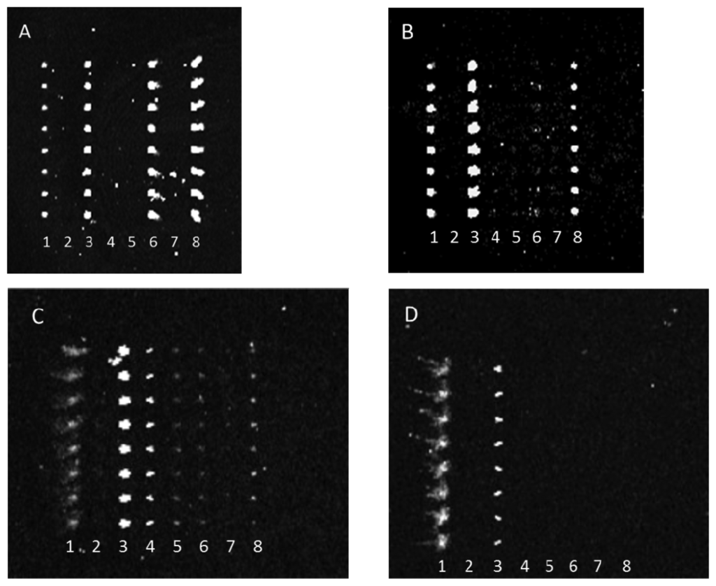 Since this work focuses on proof-of-concept for a novel typing array, the data was compiled and presented in a semi-quantitative manner. This was not only justified by qualitative observation being sufficient for determining positive versus negative responses (from visual analysis of induced-fluorescence scanned images), but also based upon observations that purified PSU IgGs, diluted over 3 orders of magnitude in concentration, did not elicit any discernible difference in response at constant levels of bacterial cell exposure.