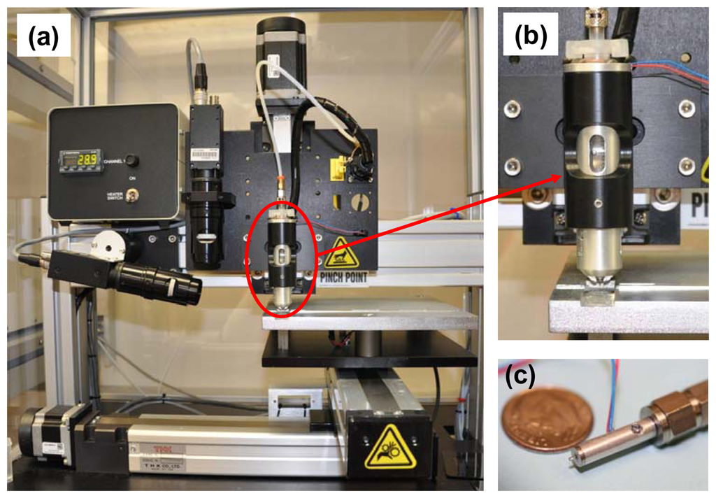 Test materials were fabricated using a JetLab® 4 (MicroFab Technologies, Plano, TX, USA) tabletop printing platform. The system is shown in Figure 1(a). The JetLab® 4 is a drop-on-demand inkjet printing system with drop ejection drive electronics (JetDrive™ III), a drop visualization system, and precision X, Y, Z motion control. The standard manual pressure controller (Fairchild®, Winston-Salem, NC, USA) was upgraded with a COTS electronic pneumatic pressure controller (MicroFab). The dispensing device (print head assembly, MJ-AL-01-060) consists of a glass capillary tube with a 60 μm diameter orifice coupled to a piezoelectric element. Photographs of the dispensing device encasement and the print head assembly are shown in Figure 1(b,c), respectively. Voltage (V) pulses applied to the piezo result in pressure fluctuations around the capillary. These pressure oscillations propagate through the printing fluid in the tube, resulting in ejection of a microdrop. Both sinusoidal waveform voltage pulses and standard waveform bipolar voltage pulses were used to generate microdrops. The echo (negative) part of the bipolar pulse is used to cancel the residual acoustic waves propagating in the tube and therefore optimize the drop break-off.