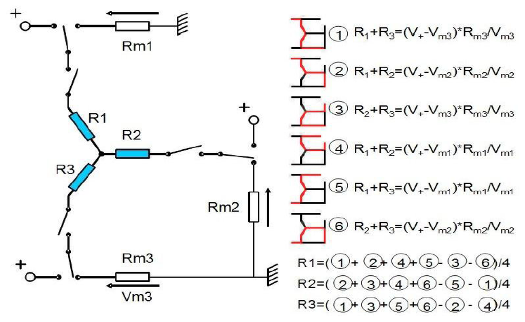 Among electrical measures able to give information on the table position is the measure of electrical resistance in droplets. Each bubble is considered individual resistance Ri and the conducting table connects the droplets (in Figure 3, shown below, the table is located at the node connecting R1, R2, and R3). These unknown resistances can be measured using the electrical circuits shown in the right insight of Figure 3, leading to the indicated electrical equations.