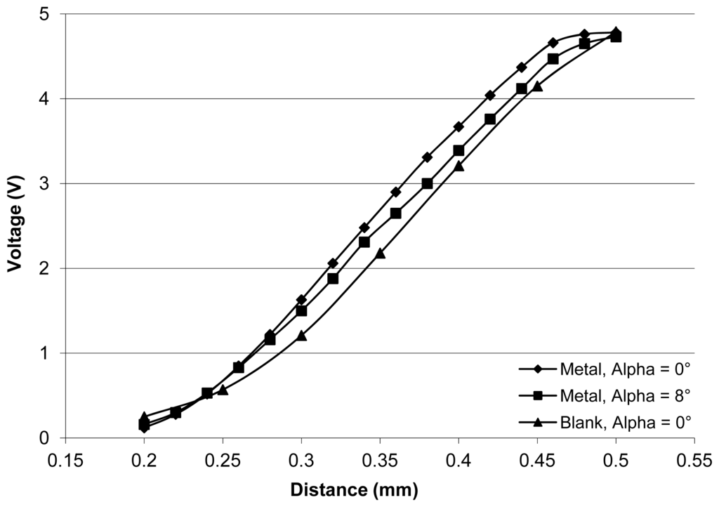 Figure 5 shows a series of experimental results focused on the short-range behavior of the sensor. These results expose the error induced by the maximum target angle, that is, eight degrees, on the distance measurements. The distance determination error is lower than 20 μm, meaning lower than 5% of the measured value. In these conditions, and taking into account that the angle used for these experiments is higher than the usual operation status of such a device, the measuring capabilities of this sensor can be considered satisfactory.