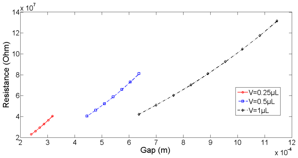 The electrical resistance of droplets is measured for the different volumes of water and for different values of the separation distance between the needle from which the bubble emerges and the top electrode. In the first step, the electrode is placed far from the contact position and the droplet is created (for three different volumes). The electrode is then lowered until contact occurs, which represents the zero position. The electrode is then progressively lowered until reaching 200 μm, pressing on and deforming the droplet more and more. At each step, the drop resistance is recorded, and results can be found in Figure 8.