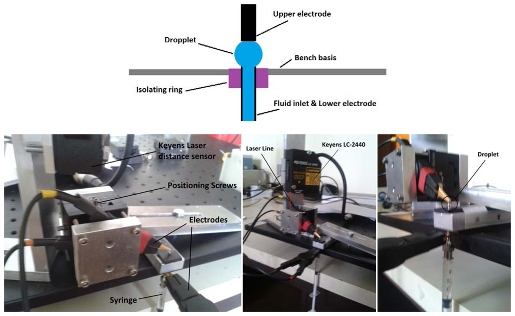 To experimentally measure the electrical resistance of the droplets, a test bench was realized. Simulations confirm that resistance values are very high (∼100 MOhm), which is why a very precise impedance-meter (WAYNE KERR Precise Component Analyzer 6425, Chichester, UK) is used. The measurements of the distance between the bubble base and its top vary between 200 μm and 500 μm. A Keyence LC-2440 laser is used to acquire the necessary resolution for these measurements. A syringe containing distilled water is vertically suspended so that its needle pierces a hydrophobic polymer material. The end of this needle simulates the exit of one of the table basis pipes. One electrode of the impedance-meter is connected to the syringe metallic needle, while the other electrode plays the role of the table, ready to make contact with the droplet as it exits the needle (Figure 7).