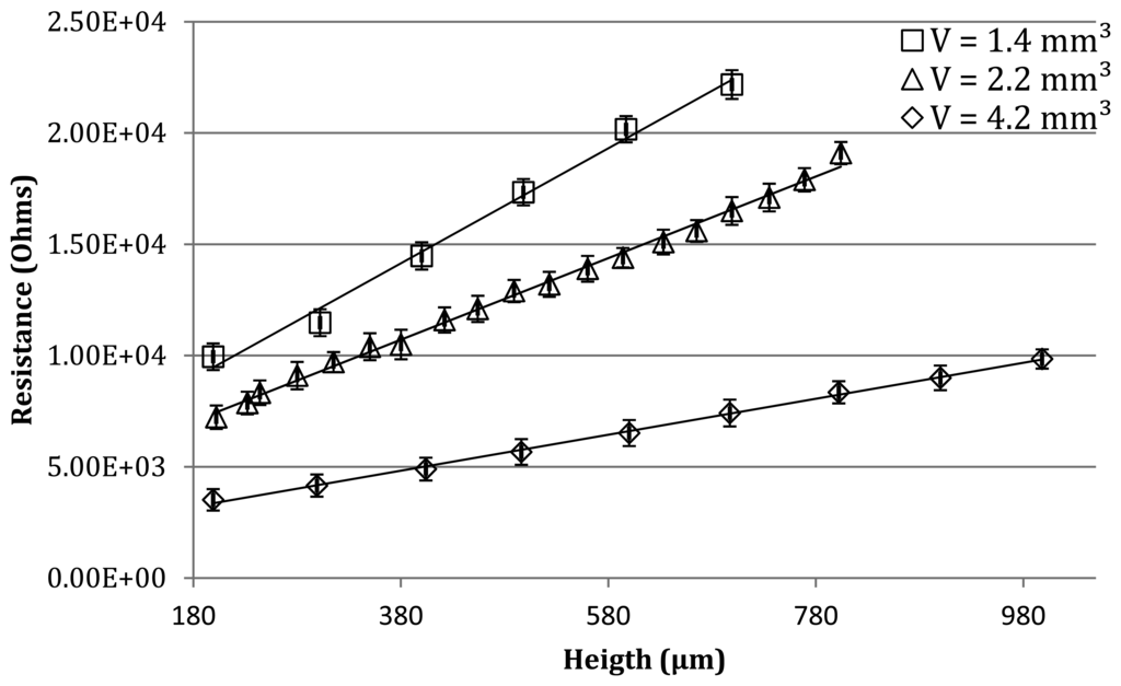 Experimental measurements and theoretical results demonstrate coherent behavior: R increases linearly as a function of H, with the slope decreasing as the volume of liquid increases. Although the quantitative measurements of the resistance show significantly smaller results (about 10 kOhm) than expected from the simulation (about 100 MOhm), this result could be explained by water contamination, which could influence the impedance exhibited by the tests bench. The quasi-linear behavior of the resistance with the drop length is however confirmed. The slope coefficient decreases with volume augmentation. The conclusion is thus similar to what was encountered in theory. The resistive measurements of the droplet height is however impossible without some supplementary information such as the volume of liquid. Indeed, for similar height, droplets with different volumes and shapes could exhibit different electrical resistances. Achieving a positioning system based on resistive measurement thus implies additional features that provide enough information to be able to fully describe the system state. More particularly, for the resistive method to be used, we need secondary information for each droplet. This additional information can be for instance the volume of liquid, which may be part of the initial conditions of the system. In case of evaporation however, this raises further questions.