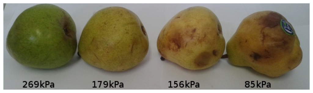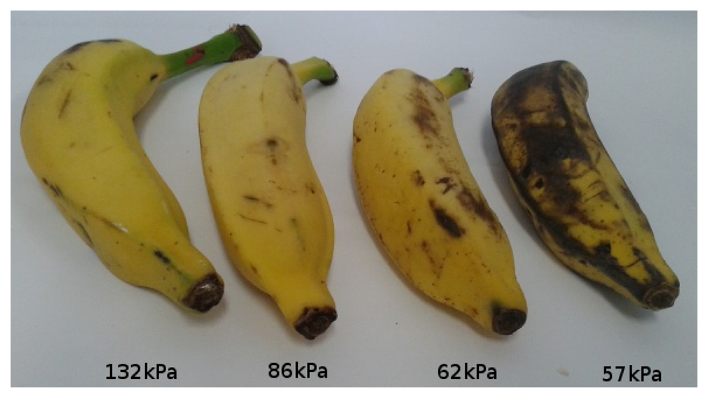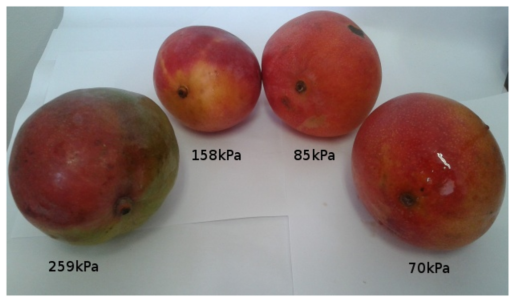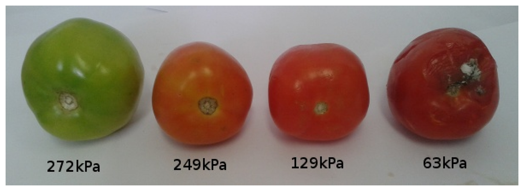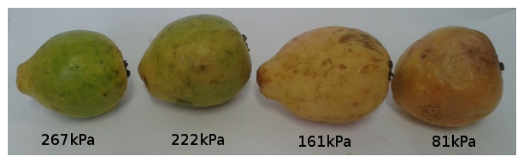 Although simple and practical, Calbo et al. explain that this method and variations of it are still not used in commercial instruments to measure turgor [69]. As a possible solution, they recently proposed a miniaturizable sensor system for measuring cell turgor, an important fruit firmness component that is used in this work as explained in Section 4. Their system can be used to build a hand-held device that can be manually pressed against fruits on the market to instantly obtain fruit firmness [69]. According to these authors, mature fruits should present pressures ranging from 0.2 to 1 kgf/cm2 and mature green fruits present pressures from 1.5 to 4 kgf/cm2. In all cases, pressure values close to zero means that the fruit is inadequate to be consumed.