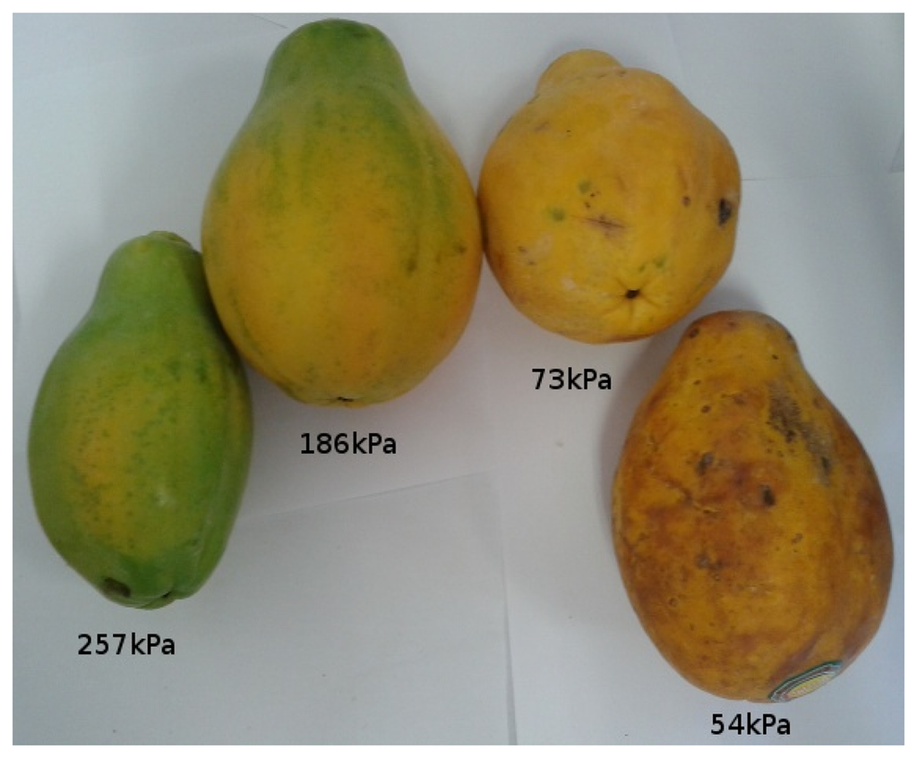 Among several mechanical properties of fruits, firmness is considered one of the most important quality parameters [59,68]. Traditionally, firmness measurements are based on invasive systems, such as the penetrometer. One classical and well known technique for such test is the Magness Taylor, which measures maximum penetration force [59]. Looking for non-destructive firmness measurements, researchers proposed several alternative techniques to measure firmness. Several of them are mechanical, and some are based on spectroscopy and ultrasound.