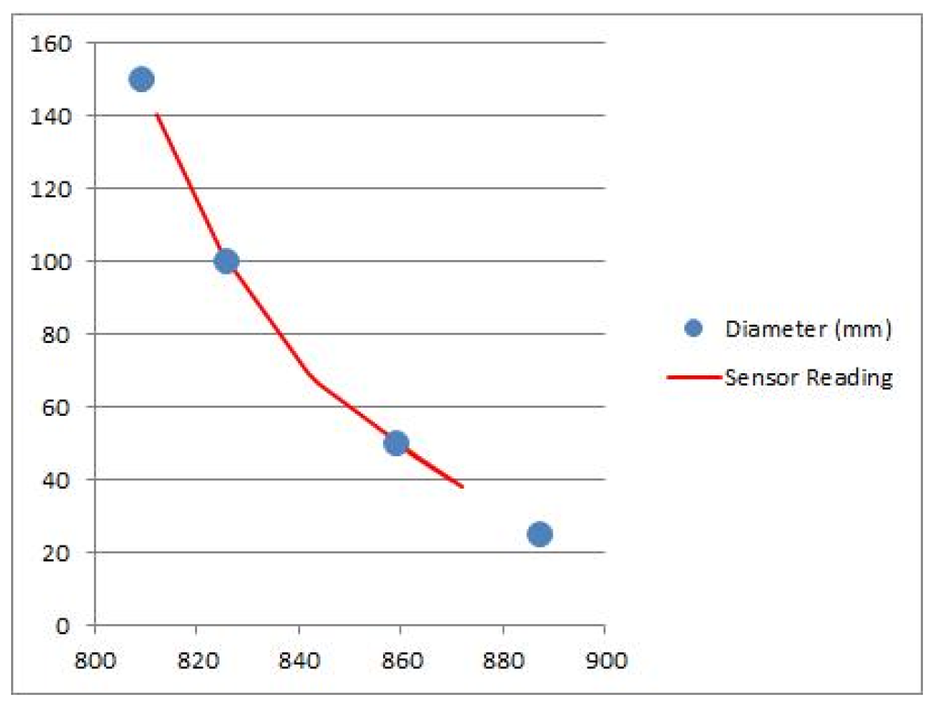 As mentioned in Section 2, volume measurement is an important metric to evaluate fruit quality. In order to measure fruit's volume we use the Fast Fuzzy segmentation algorithm to extract the fruit's image from the rest of the scene. The fruit is selected by pointing the laser at it, and then the segmentation system searches for the brightest red point in the image and segments that region. After the segmentation, the system counts how many pixels were segmented in the image. The number of segmented pixels is the area of the object. To evaluate the real metric area, we make the assumption that the object is spherical and it is projected on the camera as a circle, thus Equation (9) can be used to compute the area of the circle, which can be manipulated to give its radius as shown in Equation (10).