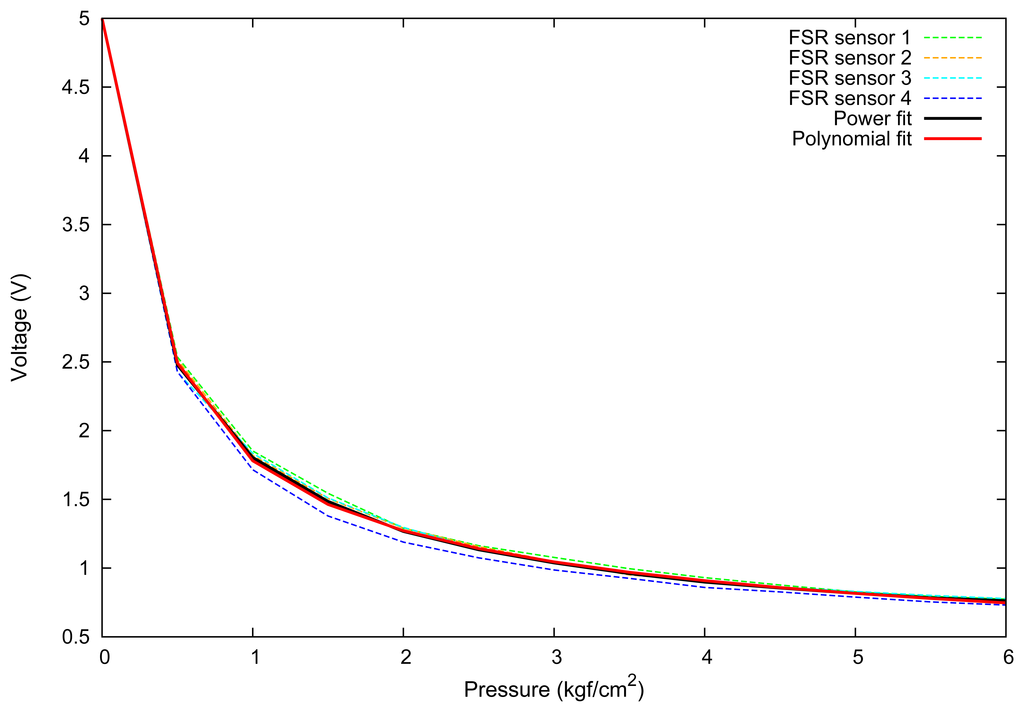 Equation (3) shows the result of the second degree polynomial fit for the FSR sensor, which had a determination coefficient r2 = 0.95 and is shown in the plot of Figure 6.