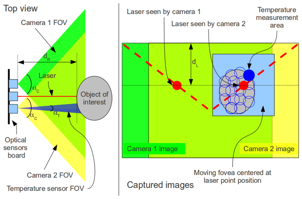 Figure 8 shows the optical layout of the sensors with their fields of view highlighted in blue, green and yellow. The left diagram shows a top view of the cameras capturing an object image, and the right diagram shows an example of the resulting images. Note that most of the scene intersects in both cameras. The figure also shows the remote temperature measurement accomplished by the infrared temperature sensor that measures the temperature of a given area proportional to its distance from an object.