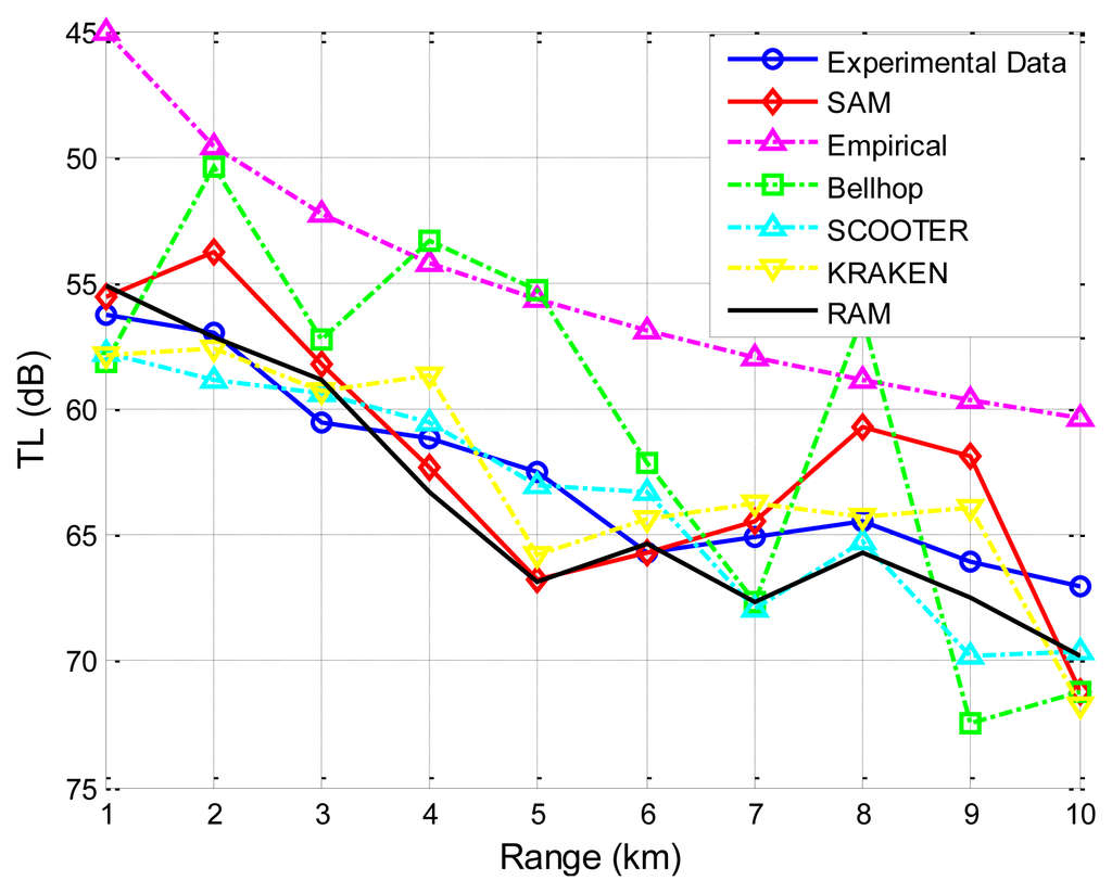 The plots in Figure 9 indicate that our proposed model and the four physics-based models follow a similar trend and show better agreement with measured transmission loss values than the empirical approximation does. Since the empirical approximation does not account for multi-path effects, this trend is expected. It is noted that, for RAM and Bellhop, as the communication range increases, the differences between predicted results and measured experimental results become greater. This is because in long-range underwater acoustic communications, severe multi-path effects will occur, and the received signal is the sum of a large number of these multipath arrivals, each of which is modeled as a complex stochastic process. For effective channel modeling, the variation of each path signal caused by the sea boundary (the sea surface and the sea bottom) should be taken into account. However, for RAM, the scattering on the rough surface/bottom boundary is not dealt with Reference [39]; while Bellhop does not implement the rays' phase shifts, which would be necessary to provide a better treatment of the reflection coefficient [4,12]. However, the variance between experimental data and predicated results by KRAKEN, SCOOTER and SAM is mostly less than 5 dB. Both KRAKEN and SCOOTER calculate an equivalent reflection coefficient for the sea surface/bottom and incorporate it into the model in a tabular form with essentially perfect accuracy, and the performance degradation is due to the coarse sampling of the reflection coefficient. Moreover, SAM utilizes the popular surface/bottom reflection model that has closed-form expression to incorporate the boundary influences on the rays' amplitudes and the phases. It is noted that there are still deficiencies in the four physics-based models and in SAM. For the physics-based models, the accuracy depends on the environmental parameters, boundary conditions, and the approximation adopted. Therefore, lack of accurate real-time environmental input and approximation errors might explain the discrepancies [4,12,25]. For SAM, inaccuracies may be due to inaccurate environmental inputs, insufficient resolution in discretizing the ocean column into multiple sub-layers, insufficient number of rays traced to generate the eigen-rays, and the sea surface/bottom reflection models chosen.