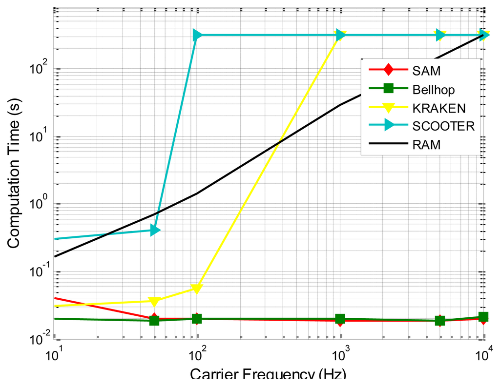 Since the phase shifts corresponding to multiple paths may cause constructive or destructive interference on the received signal, they play an important role in the transmission loss prediction, as is demonstrated by SAM's better prediction ability than Bellhop as shown in Figures 10 and 11 (since it is hard for a single channel model to precisely capture all the characteristics of the underwater channel, the better predictive ability provided by SAM in these two experiments may not necessarily mean that SAM will always give the best prediction). Besides, the surface/bottom boundary influence is incorporated based on the current standard model with closed-form expressions. More importantly, the average computational times under different models for a single transmission on a PC with AMD Athlon 64 × 2, CPU 5,000+, 2.60 GHz, and 2 GB processor, are compared in Figure 11, showing that the computational complexity of SAM and Bellhop is independent of the frequency while the computational complexity of KRAKEN, SCOOTER, and RAM increases quickly with the carrier frequency [37]. SAM enjoys, for some runs, three to four orders of magnitude lower computational complexity. Table 2 shows a comparison between the Empirical model, SAM, Bellhop, KRAKEN, SCOOTER, and RAM.