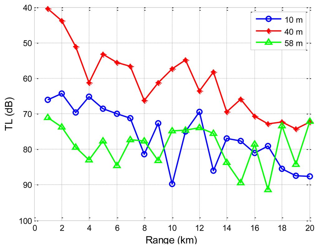 Secondly, we address the impacts of source depths on the transmission loss through SAM. The sound speed profile and oceanographic parameters from Reference [38] are used. Details can be found in Section 4.1. The source node is located 40 m underwater. The carrier frequency is 1,000 Hz. The transmission loss performance using SAM is shown in Figure 13 for three different destination depths: 10, 40, and 58 m underwater. Noting that the y axis is upside down, the transmission loss is the smallest when the destination is located 40 m underwater. From Figure 9, we can find that the sound speed is minimal at 40 m deep. According to Snell's Law, an acoustic ray always bends towards the side with smaller sound speed. Therefore, eigen-rays connecting the source and the destination, both located 40 m underwater, propagate via refracted paths without encountering reflection losses at the sea surface or the seafloor, giving the smallest transmission loss. However, for destinations located at 10 and 58 m, near the sea surface and the sea floor, the rays from the source to the destination interact with the sea surface and sea floor, resulting in additional energy loss. These results indicate that the underwater acoustic communication performance variation is largely aligned with source/destination configurations.