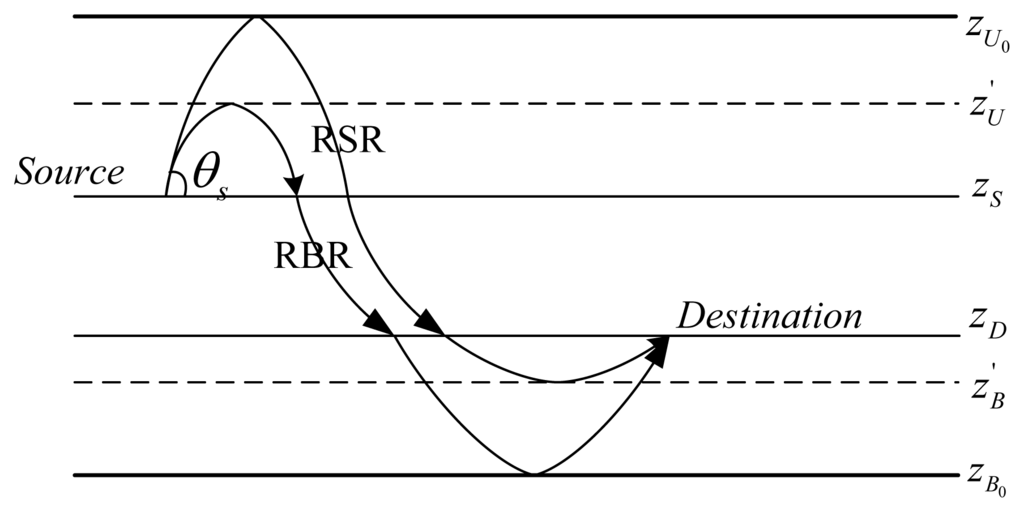 Specifically, if zcri > zS, the ray will bounce off the sea surface and turn towards the destination before hitting the sea bottom (Refracted Surface-reflection Ray, RSR, shown in Figure 3); if zcri < zS, the ray will turn before hitting the sea surface, and then bounce at the sea bottom before reaching the destination (Refracted Bottom-reflection Ray, RBR).