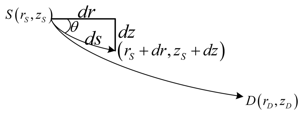 Firstly, the direct ray is studied. As shown in Figure 4, the curvilinear length lDirect and the delay tDirect for a ray from S(rS, zS) to D(rD, zD) can be written as Equations (11) and (12), respectively, where cS is the sound speed at the source's depth, and θS is the horizontal incident angle at the source's depth: