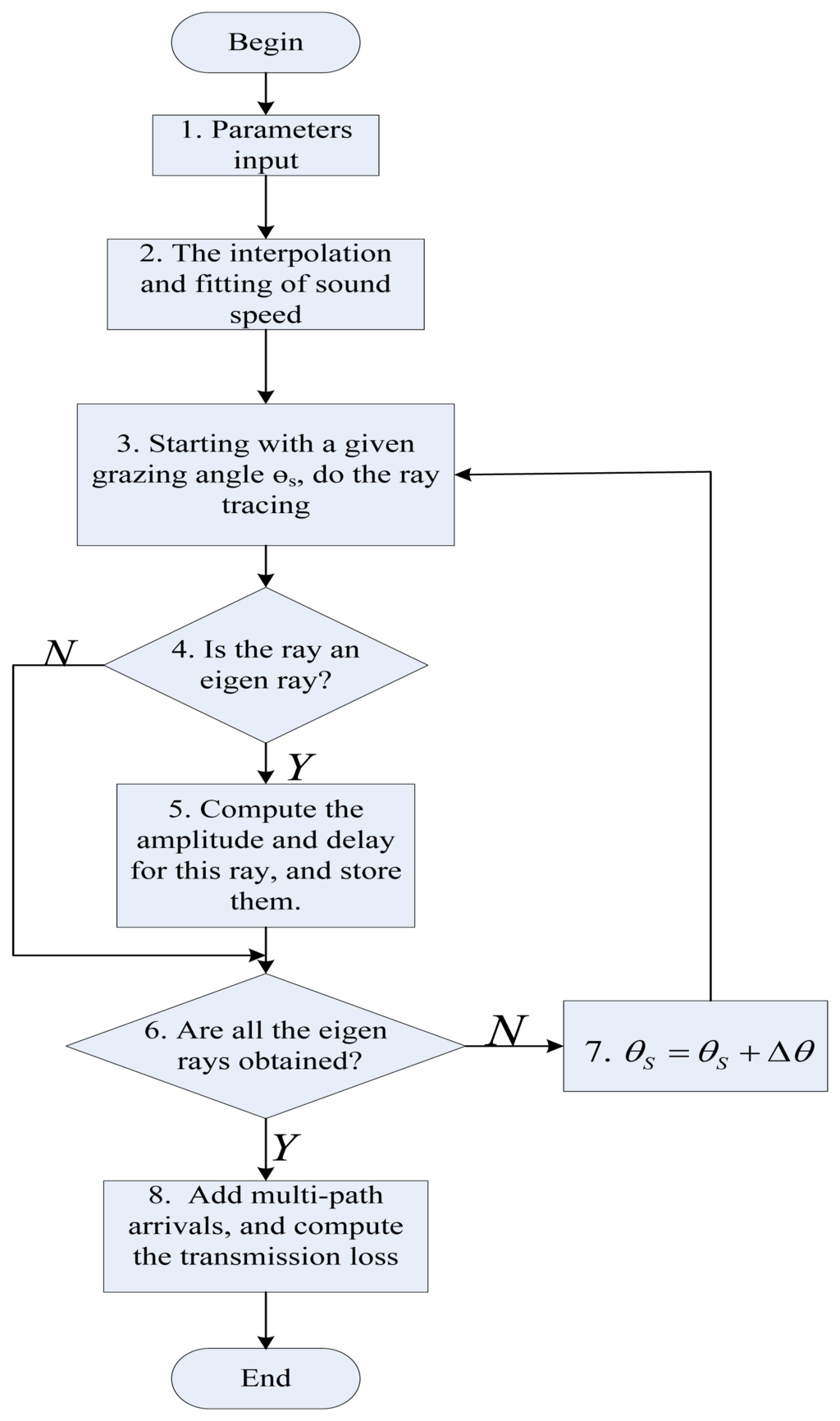 Based on Equation (9), the horizontal distance V traversed by this ray can be obtained by tracing the trajectory of each ray referred to in Step 3. Then, to decide whether a ray that starts from the source with a specific grazing angle θs is an eigen-ray or not in Step 4, the assumption confirmation method is applied, that is, if Equation (10) is satisfied, this propagation path with a take-off angle θs is taken as an eigen-ray. Then, based on Equation (14), if the delay is less than one symbol duration Ts (e.g., 1 ms; Ts is the inverse of the achievable data rate. Here it is assumed the data rate is 1 kbps, which can be achieved by some off-the-shelf underwater modems (e.g., UWM2000H made by LinkQuest Inc., San Diego, CA, USA[36])) this ray with a take-off angle θs is one of the rays that will be counted when calculating the underwater channel response in Equation (18). Then, based on Equations (13) and (14), computation in Step 5 can be completed. After tracing all the rays, finally, according to Equation (20), the transmission loss is output in Step 8.