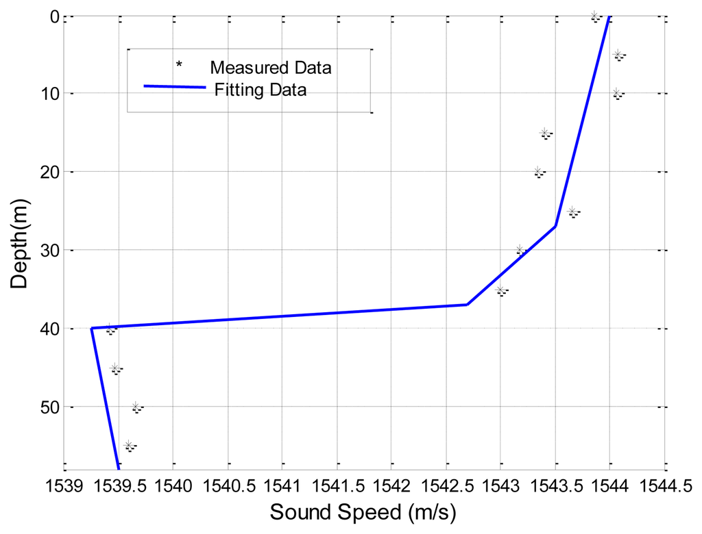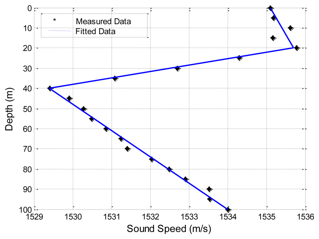 Often, the ocean sound speed profile (SSP) is provided at discrete depths and careful thoughts must be given to properly interpolate this data in Step 2. Here we use a piecewise linear fitting method to approximate the variation of sound speed with depths. Take an example shown in Figure 7, the dots are measured sound speeds at discrete depths in a zone of the China Sea. The sound speed increases slightly with depths for 0–20 m, decreases with depths for 20–40 m, and increases with depths for 40–100 m. Therefore, we approximate this sea volume with three layers as plotted in three straight lines in Figure 7.